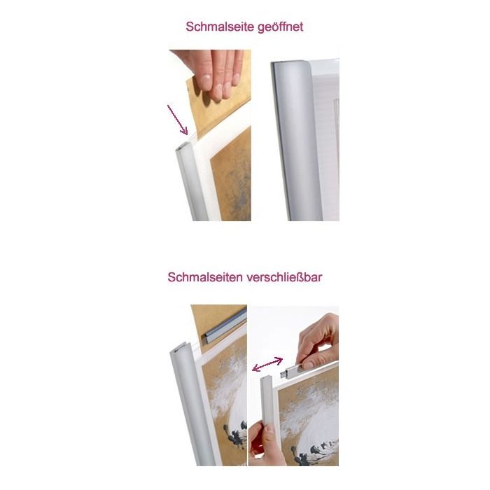 Plakathüllen mit Aluminiumumrandung sind für hohe Ansprüche konzipiert. Als stabilisierender und dekorativer Kantenschutz sind umlaufend speziell abgestimmte Alu-Schiebeprofile fixiert.