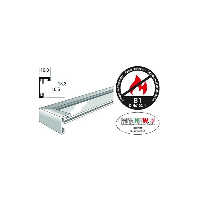 Der kantige C2 Wechselrahmen von Nielsen wurde zertifiziert nach DIN 4102-1 vom Materialprüfungsamt Nordrhein-Westfalen. Damit trägt er das Prüfsiegel B1 für Schwerentflammbarkeit. Seine schlichte, zeitlose Eleganz bringen jedes Motiv erstklassig zur Geltung.